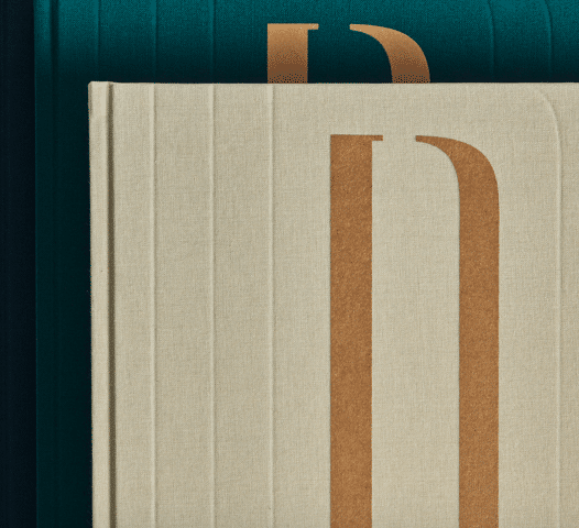 Papéis utilizados: Symbol Tatami White 170 g e Materica Clay 180 g. Capa dura em tecido mais estampagem a seco e costura com fio.