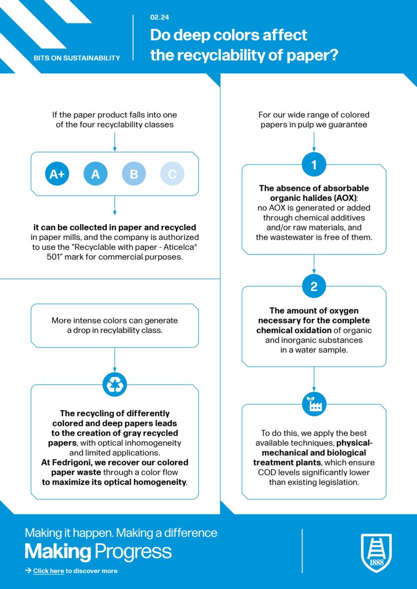 É verdade que as cores mais fortes podem causar uma ligeira perda de qualidade na reciclabilidade (por exemplo, um papel pode passar de uma classificação A+ para uma classificação A se mudar de uma cor ténue para uma cor mais forte). Contudo, esta influência nunca é suficiente para tornar o papel não reciclável. Por exemplo, a reciclagem de papel de cores escuras gera papéis reciclados cinzentos com algumas irregularidades óticas, que podem ser utilizados para aplicações específicas. Na Fedrigoni, gerimos os nossos resíduos de papéis de cor através de um fluxo de cor (do branco ao preto) para maximizar a sua homogeneidade ótica.