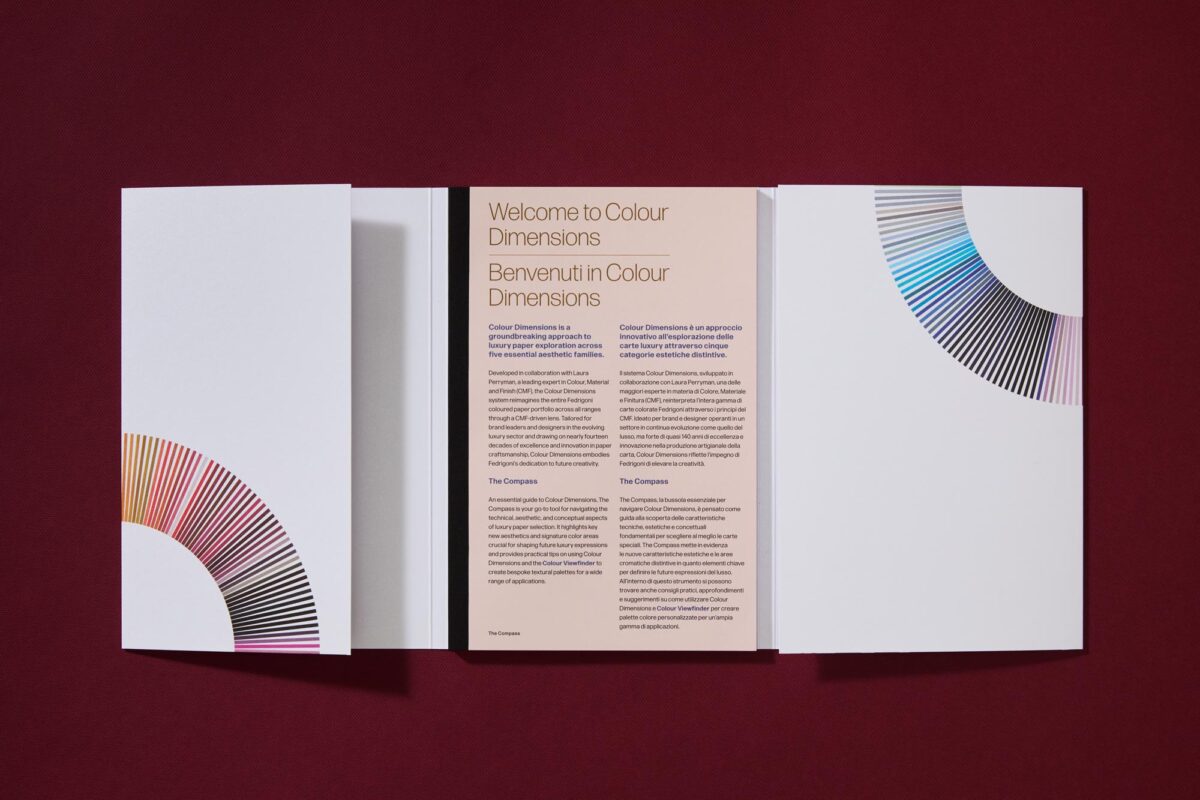 A acompanhar as cinco cinco séries de Colour Dimensions encontra-se The Compass, um guia essencial que oferece informação pormenorizada e ideias inspiradoras para aproveitar ao máximo o potencial criativo de cada papel. Das combinações mais atrevidas às tonalidades mais subtis, The Compass ajuda os designers a descobrir a riqueza desta coleção, revelando as possibilidades de cada material, cada textura e cada acabamento.