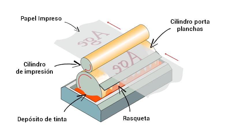 As zonas impressas serão ocas e gravadas sobre o cilindro, o qual se encontra com tinta, e na continuação usa-se folha para eliminar a tinta que sobra, ficando dentro das zonas ocas e deixando limpas as zonas não impressas.