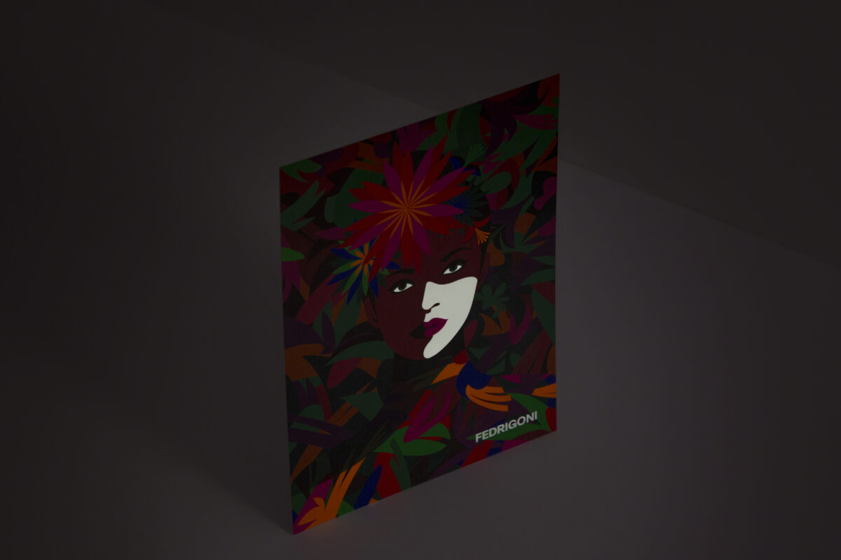 As cores não são estáticas, mudam com a luz. Reparou como a ilustração se transforma na escuridão? Graças à aplicação de uma camada luminescente, conseguimos dar vida ao rosto da ilustração ao longo de todo o dia.