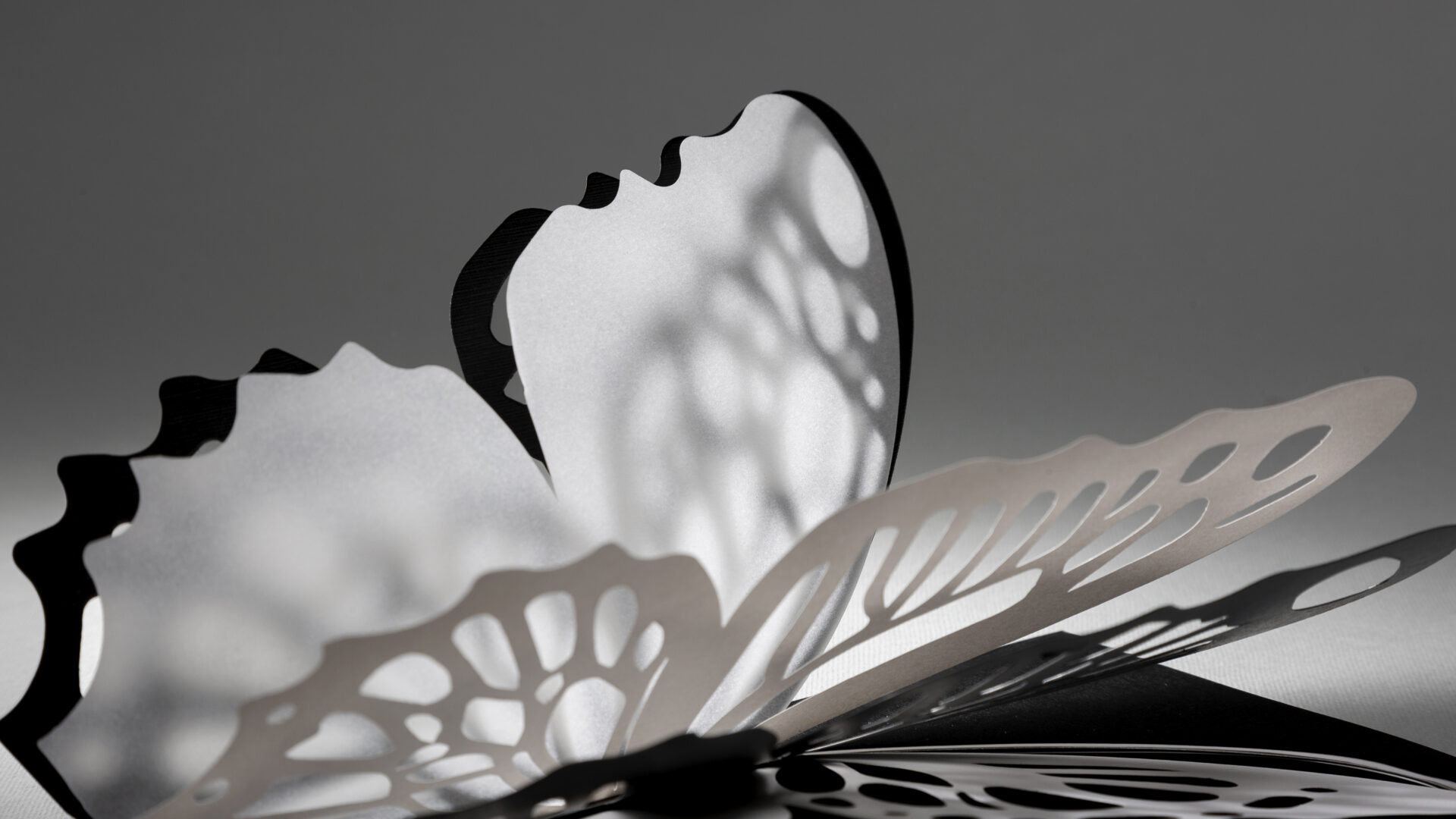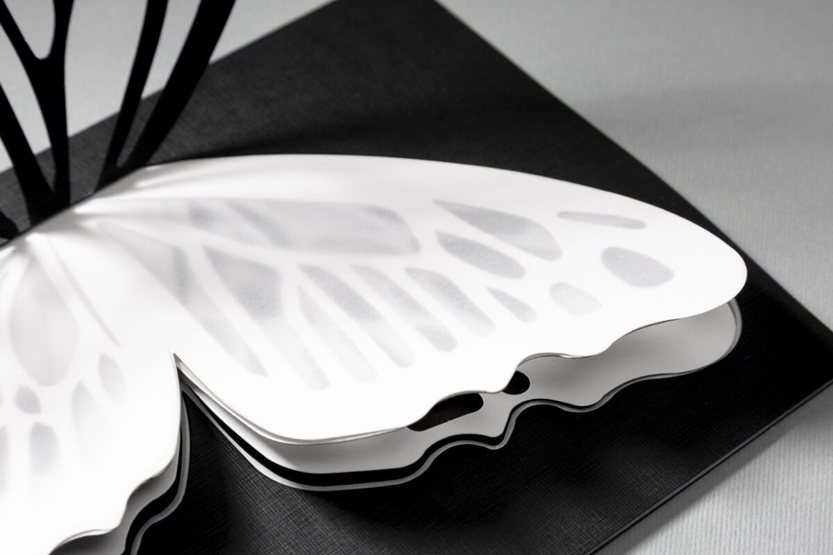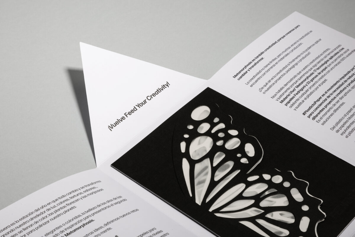 Nas asas da nossa borboleta encontrará 6 papéis da família Materia Viva® Metamorphosis, cada um exibindo uma técnica aplicada entre as várias que nos permitem disponibilizar um papel para cada necessidade. Toque nas suas asas e descubra papéis antidedadas, antirriscos, translúcidos, resistentes à luz entre diversas outras tecnologias.