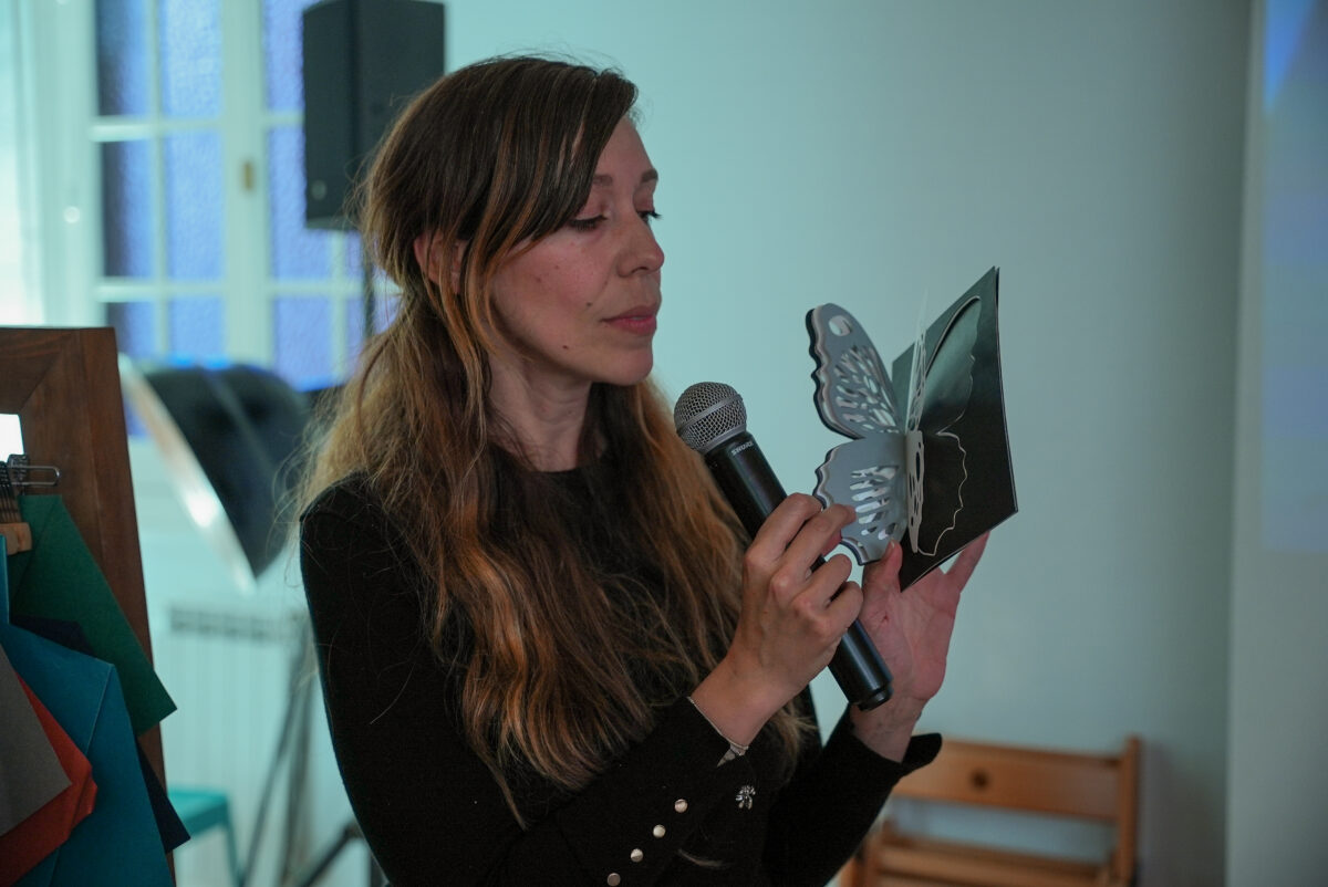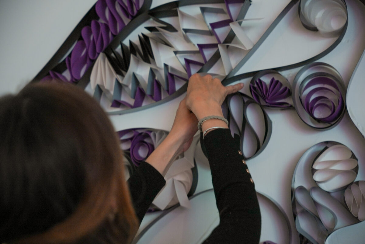 A paper artist Missmsmith – arte en papel, responsável pela realização da primeira peça da campanha Feed Your Creativity da Fedrigoni, explicou a sua experiência com os papéis de Materia Viva Metamorphosis e criou um mural com a colaboração de todos os participantes. Um asa de borboleta ganhou forma com diversos papéis de Materia Viva Metamorphosis utilizando a técnica do “paper quilling”.