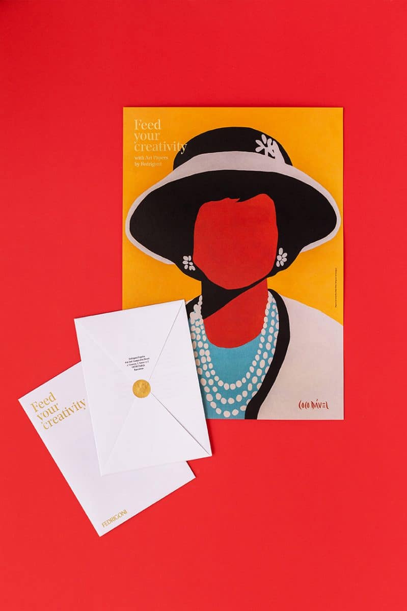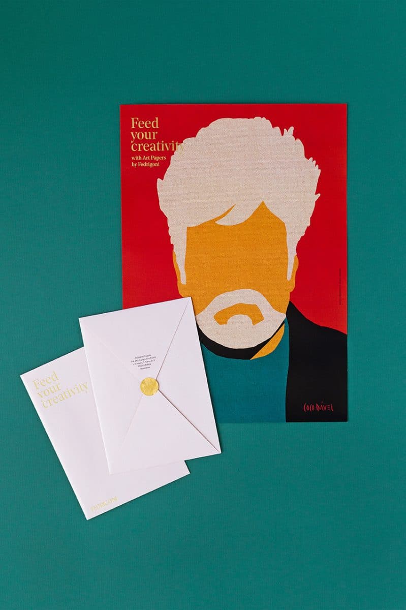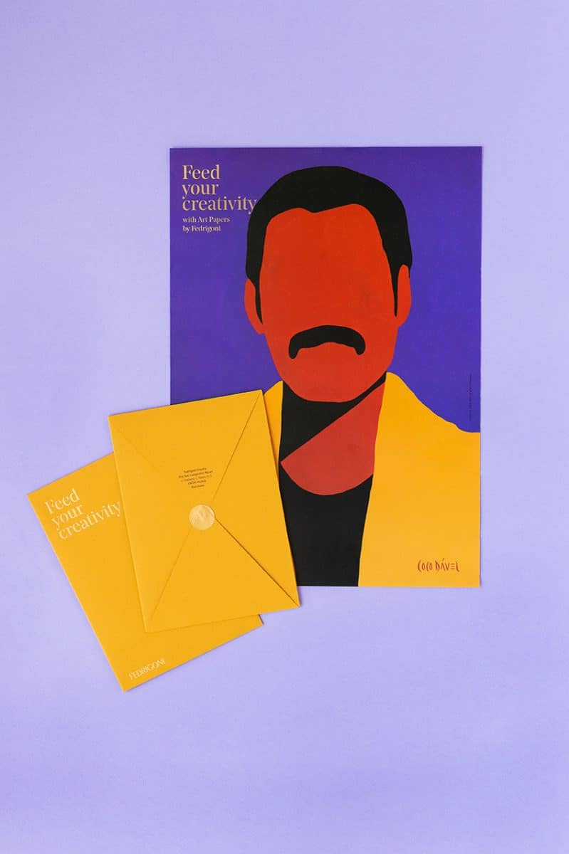 Como toque final, o acabamento metalizado do papel adesivo Adhoc Metal Gloss que fecha os envelopes, cujo tom coincide na perfeição com o da estampagem de “Feed your creativity” e combina magistralmente com as diversas tonalidades escolhidas para os envelopes e cartazes.