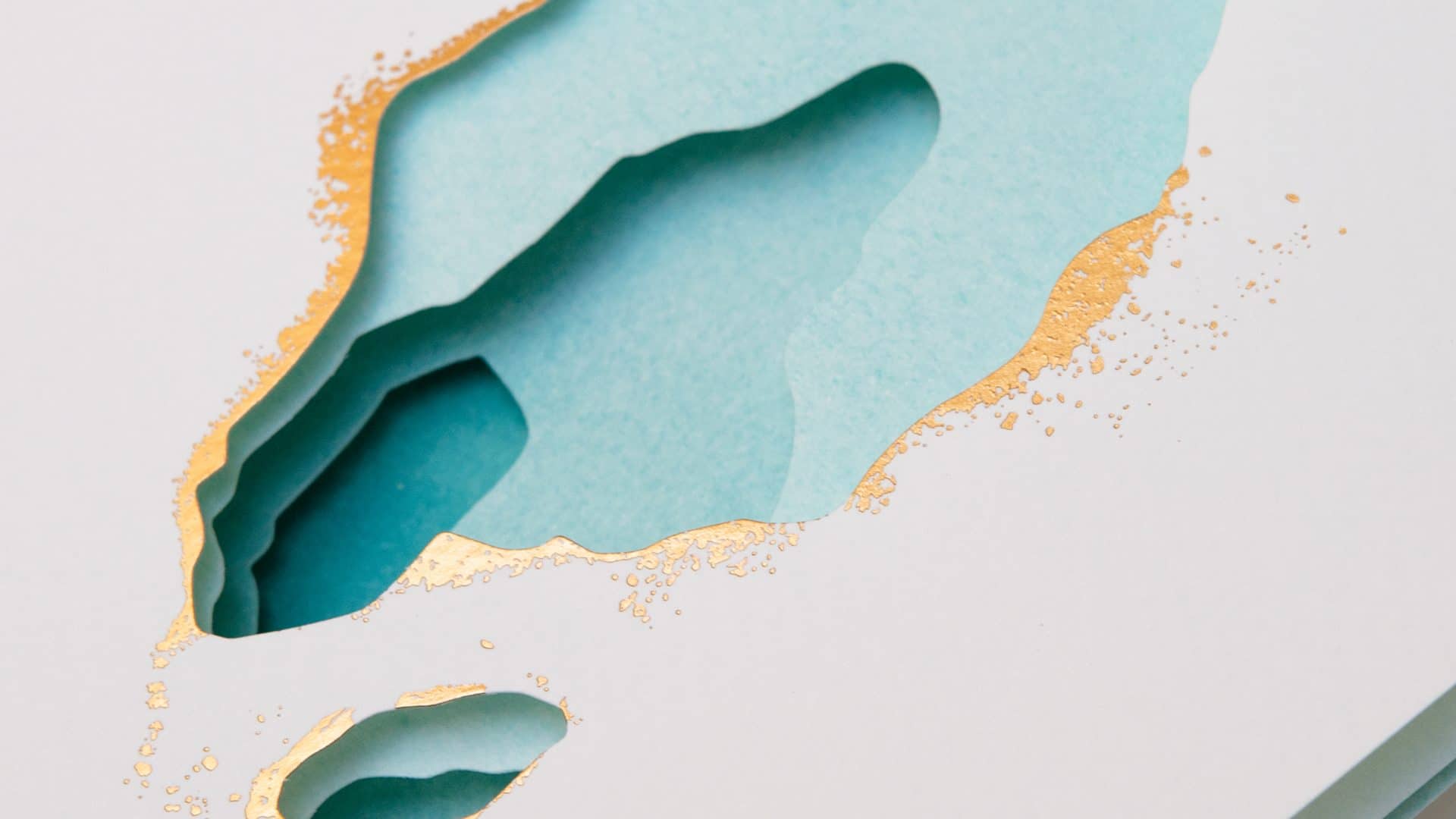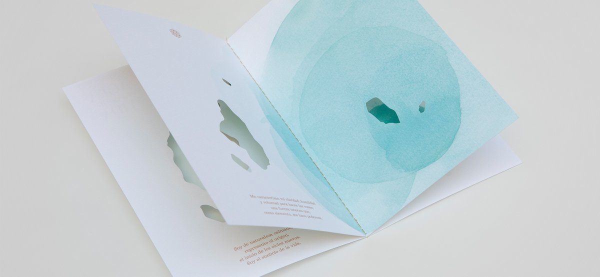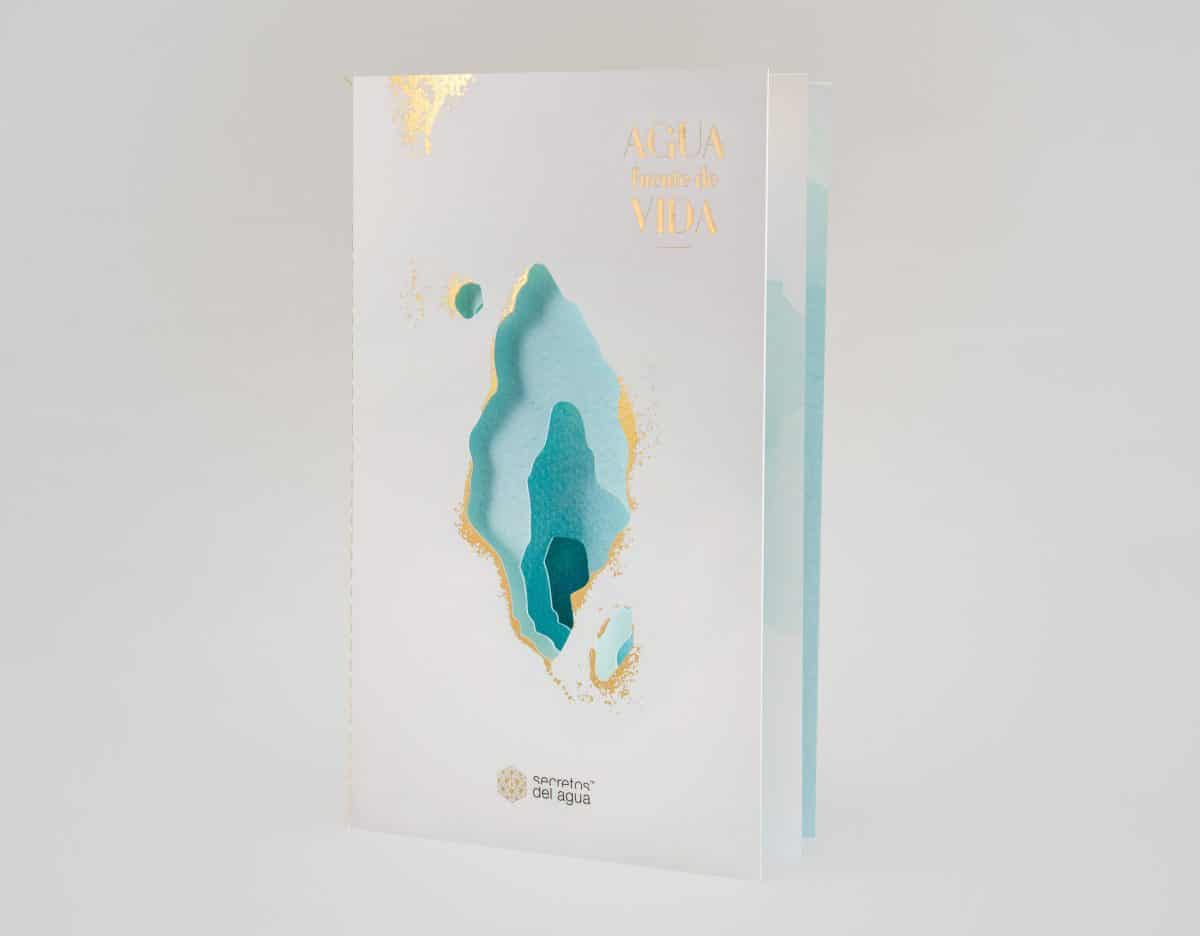 Para esse efeito não hesitaram em utilizar uma série de acabamentos especiais: a sobreposição de camadas e cadernos com cortes de troquel para criar a profundidade da gruta, a estampagem na tampa e na parte de trás a ouro velho para simular os minerais das rochas que brilham com a luz do sol, as ilustrações da água pintadas à mão com aguarelas de diversas tonalidades e a escolha do papel Cottage Premium White da Fedrigoni, de elevada qualidade e textura agradável.