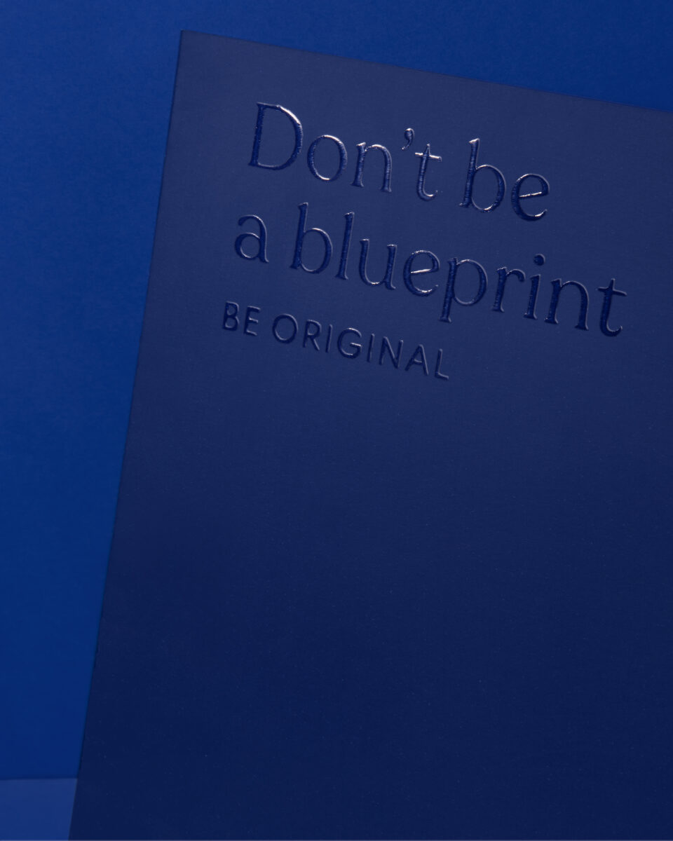 Para a produção dos materiais de comunicação foi utilizado papel Sirio Color Iris de 290 g da Fedrigoni. Um azul potente e elétrico que transmite a intensidade das peças criadas.