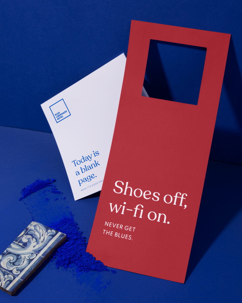Foram desenhados vários materiais para apresentar a marca: folhetos, cartões “Não Incomodar”, pastas, diretórios de serviços, cartões de visita, blocos de notas, cartões-chave, postais, bases de copos, entre outros. Todos transmitem a ideia do azul, não só pelo grafismo como também através do texto.