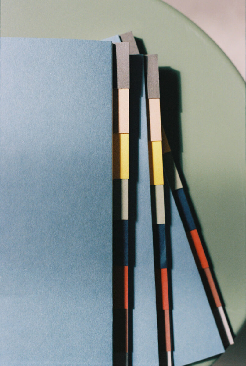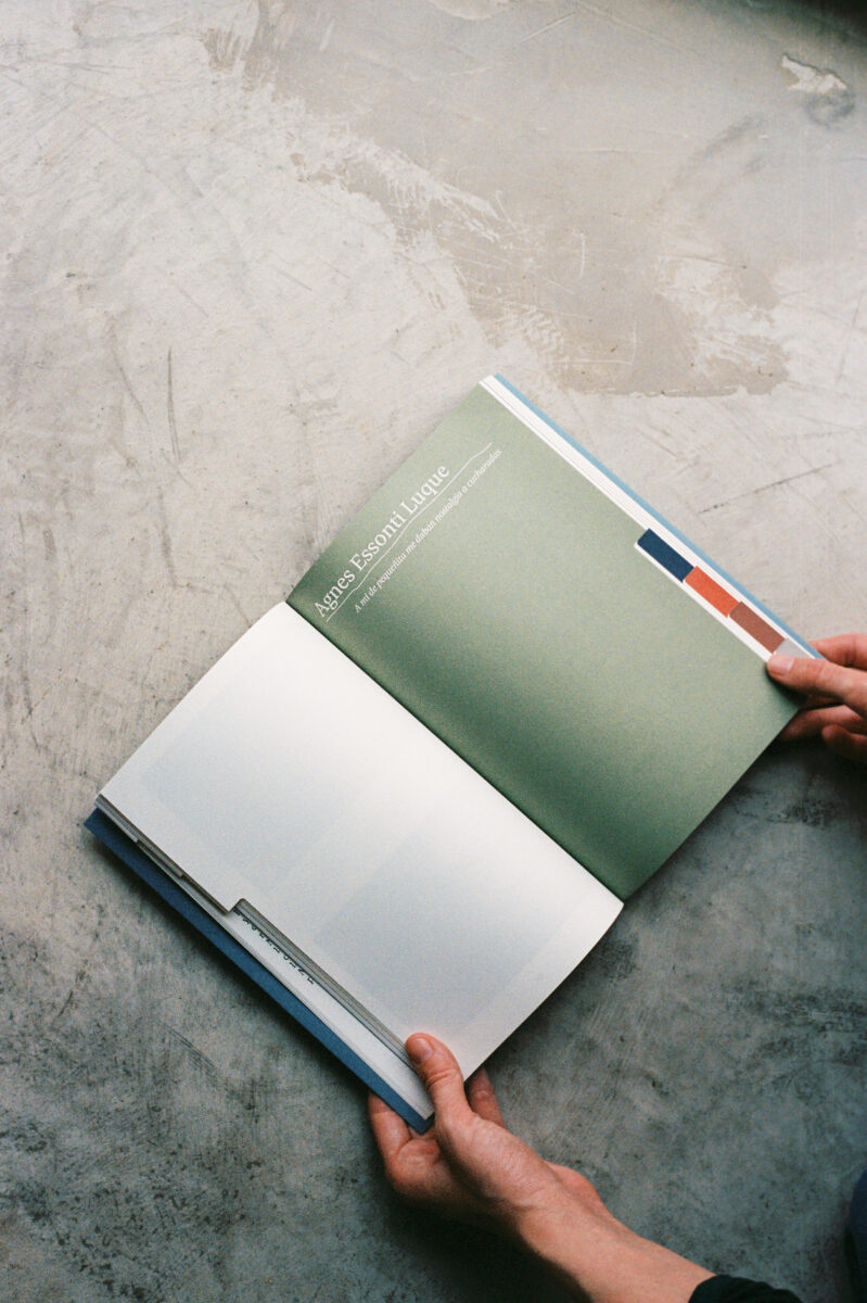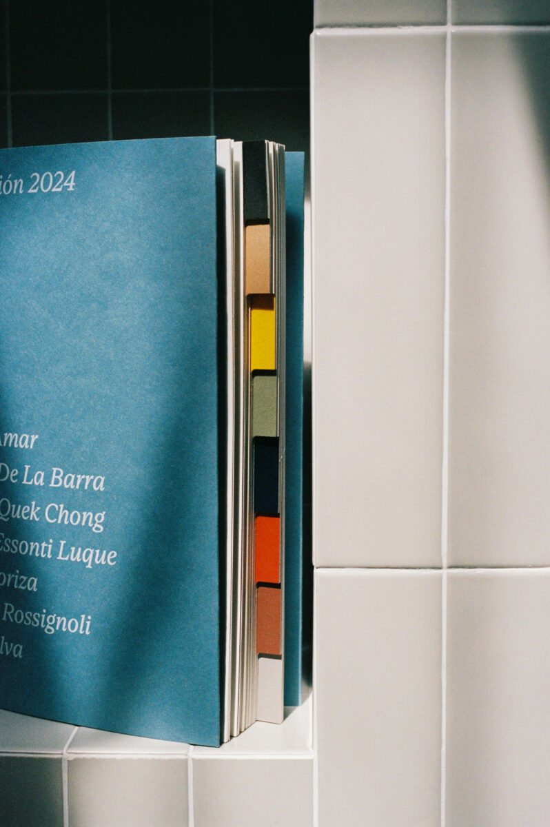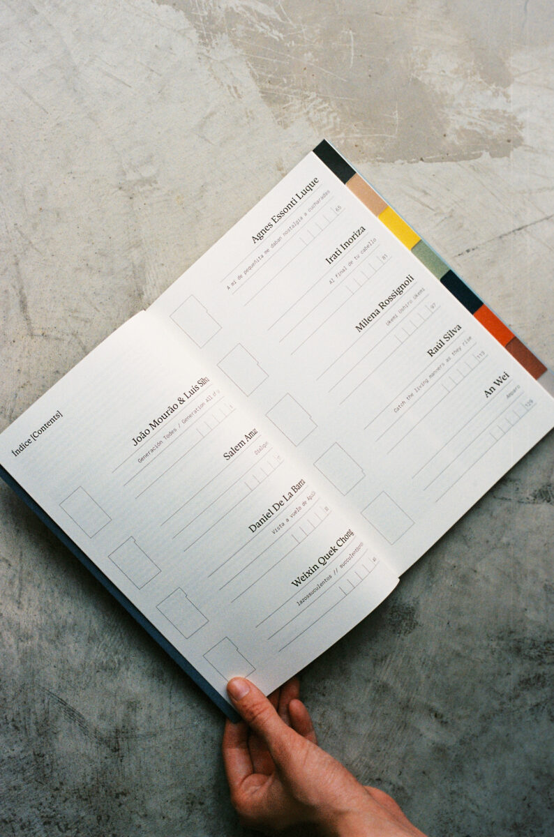 A escolha do papel Materica Aqua de 250 g para a capa foi crucial. Este papel proporciona uma textura rica e agradável ao toque, mas também evoca um estilo nostálgico, semelhante ao das pastas de arquivo usadas antigamente. Os troquéis na capa, imitando os separadores dos arquivos tradicionais, não só criam um elemento tátil e visualmente atraente, como também facilitam a navegação através do catálogo, permitindo um acesso fácil a cada artista, como se fosse uma lista telefónica.