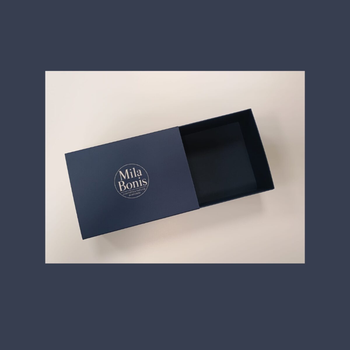 A estrutura da embalagem, em formato de gaveta com tampa deslizante, não só garante a proteção e a resistência necessárias, como também eleva a experiência do cliente criando um momento premium no momento da abertura do produto. A tampa deslizante, feita com Symbol Pack, envolve o conjunto e reforça a ligação visual com os valores de naturalidade e tecnologia avançada que definem a Mila Bonis.