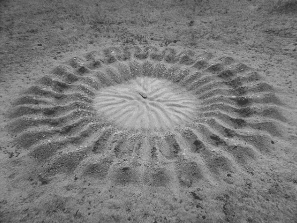 É aí o habitat do Torquigener Albomaculosus, um peixe que constrói um ninho na areia do fundo do mar para captar a atenção da fêmea, convidá-la para o seu círculo e seduzi-la. A beleza esconde-se na curiosa estrutura geométrica do ninho, semelhante a uma mandala, com uma forma circular e secções internas que brincam com a simetria.