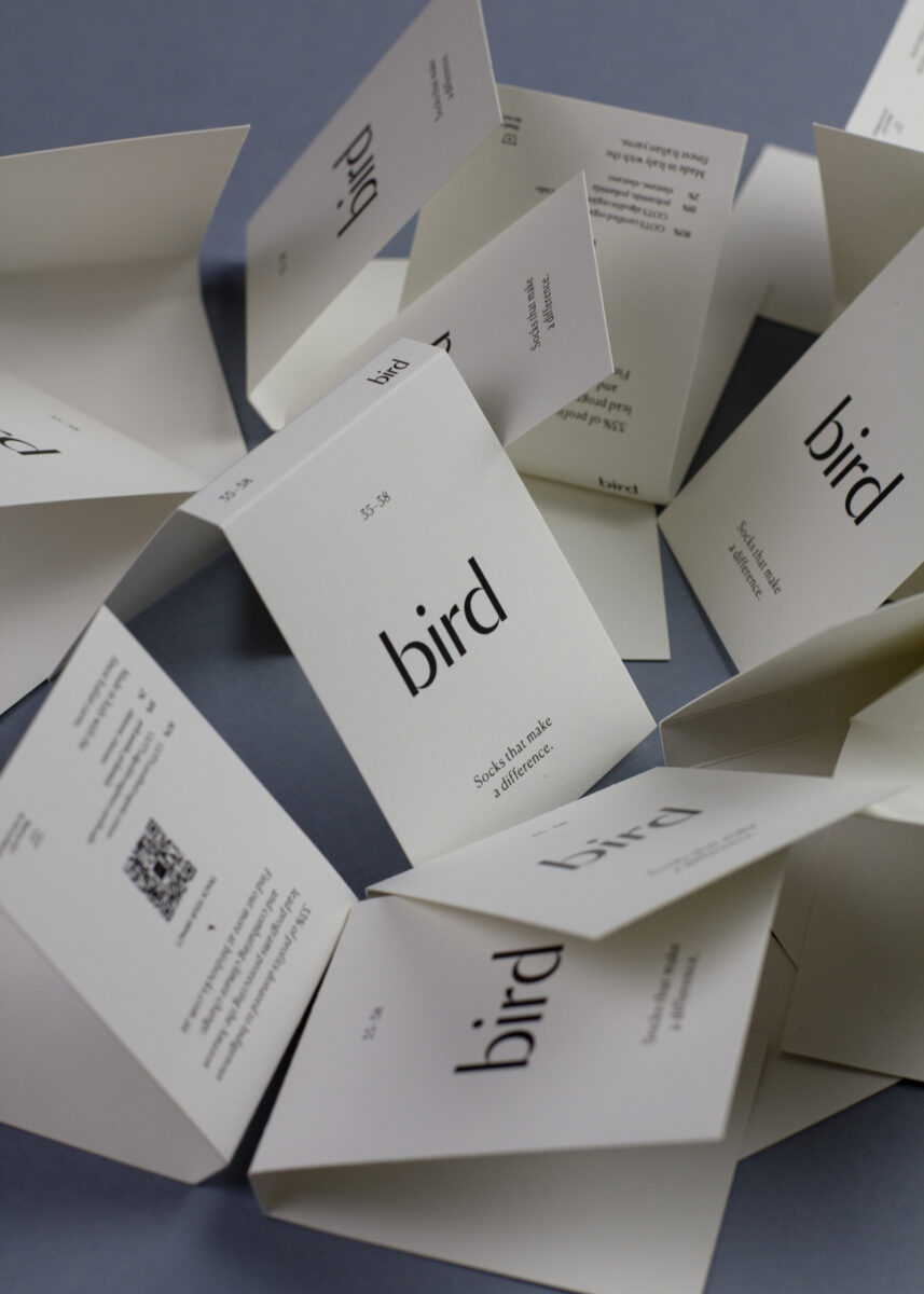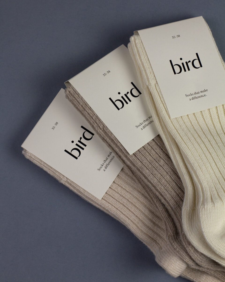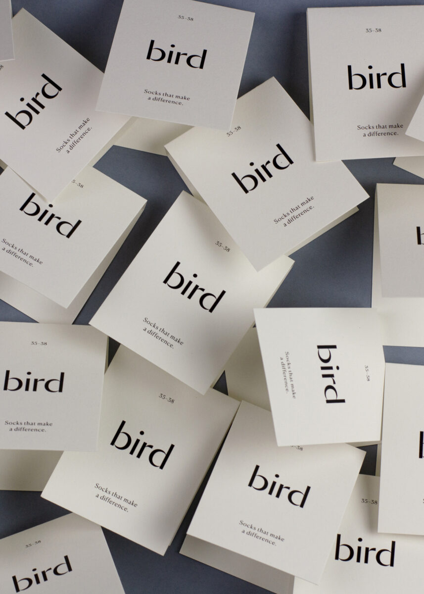 O estúdio positive design foi encarregado de desenhar o logótipo e as etiquetas da Bird Socks. Para isso basearam-se na simplicidade, na elegância e na utilização da simetria por analogia com um par de meias.