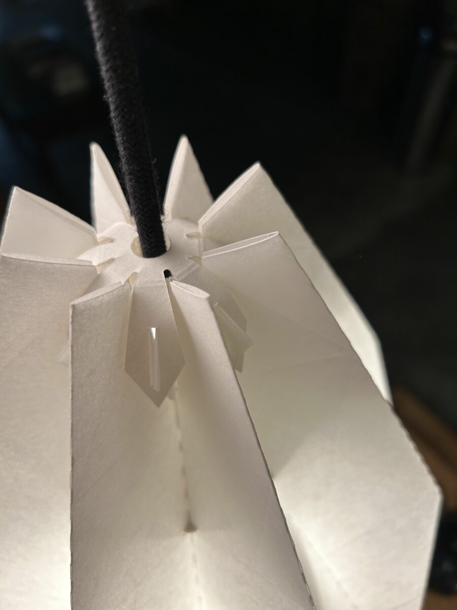 O papel ganha um grande protagonismo na concretização destes candeeiros. A GEKKŌ BCN escolhe meticulosamente para os seus desenhos o papel Fedrigoni Pergamenata Bianca de 230 g, um material excecional que se destaca pela sua textura e estética reminiscentes dos pergaminhos antigos. Este papel, produzido com celulose ECF e com certificação FSC, cumpre os mais altos padrões de sustentabilidade e ainda proporciona um toque de magia a cada candeeiro, graças ao seu acabamento de efeito nublado que difunde a luz de forma suave e envolvente.