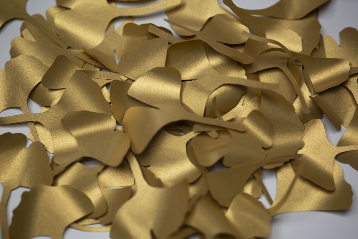 Os diferentes tamanhos e formas do desenho conseguem representar a variedade da natureza. Depois de recortadas, as peças em papel foram moldadas manualmente, uma a uma, para ganharem a forma adequada para dar vida às folhas e simular as borboletas camufladas entre os ramos.
