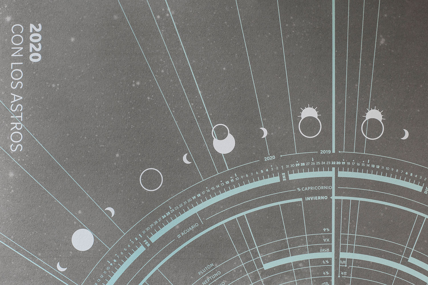A equipa de Olga Panadés mostra-nos, de relance e com um design requintado, o ano e o que acontece com os astros: dias, meses e fins de semana; fases da lua, eclipses solares e lunares, solstícios e equinócios, alterações de signos solares e planetários, retrogradações de todos os planetas, etc.