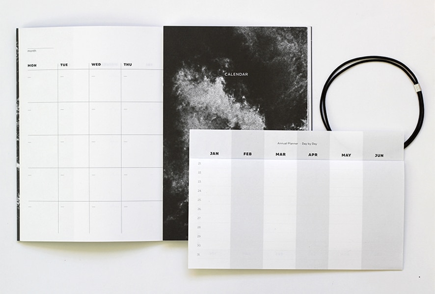 Cada mês ocupa uma página dupla e, na parte final, a agenda contém um caderno de 22 páginas para notas e, em jeito de folheto, um planificador anual com todos os dias do ano e um calendário. Uma faixa elástica mantém todas as peças unidas dentro da agenda.