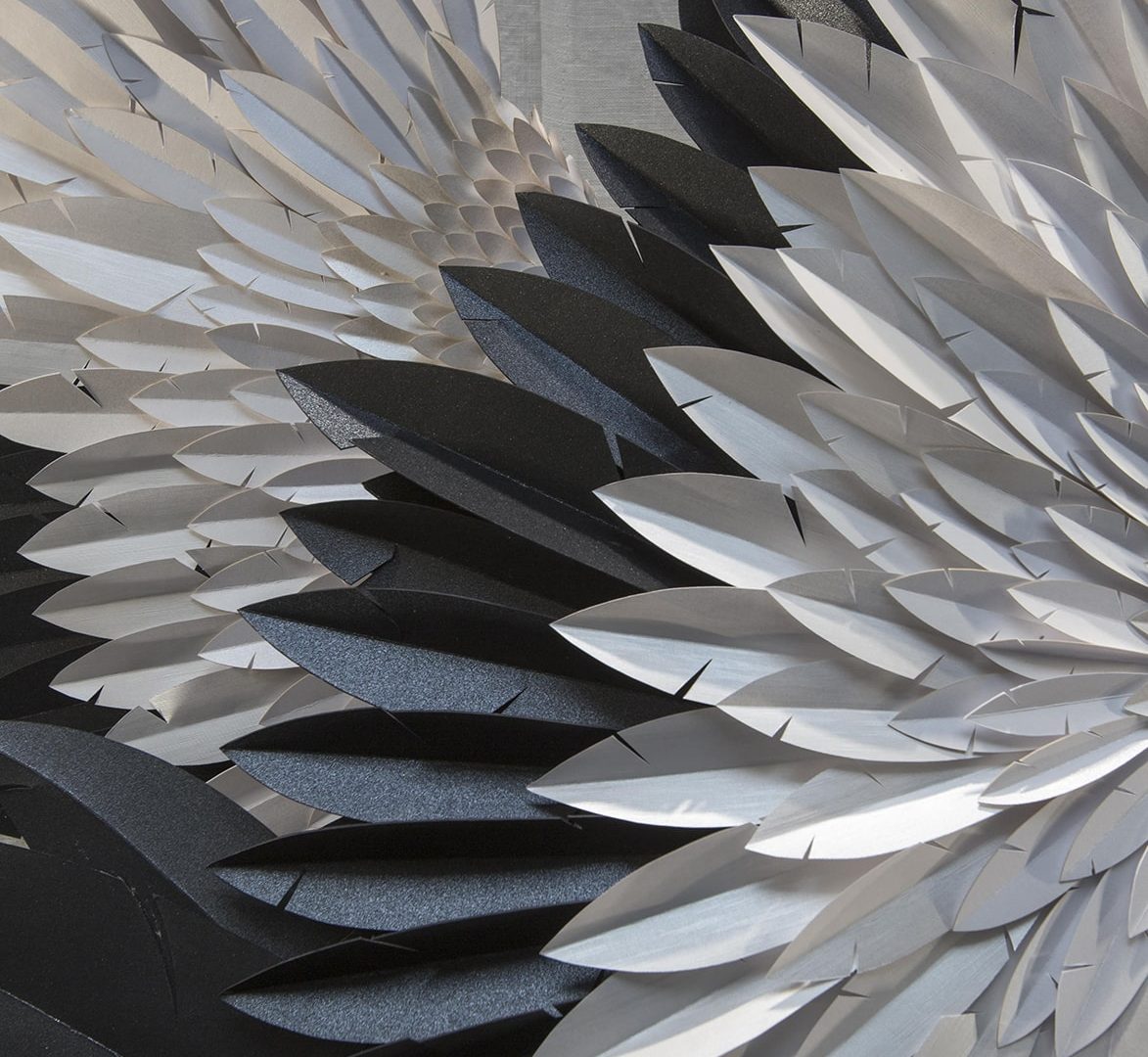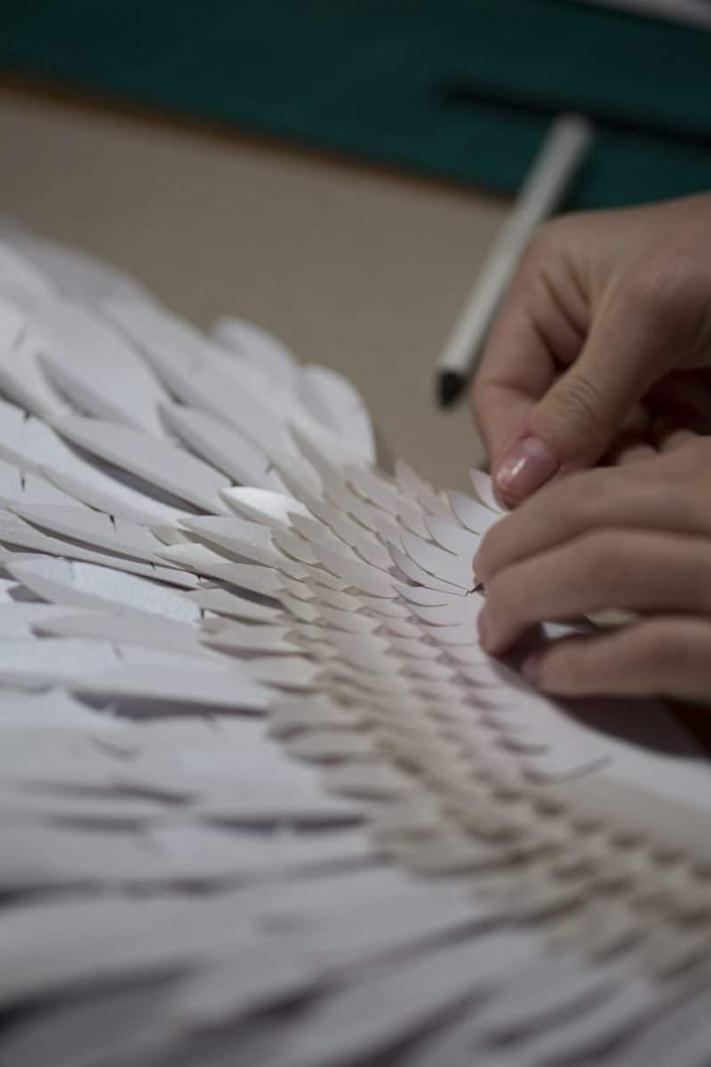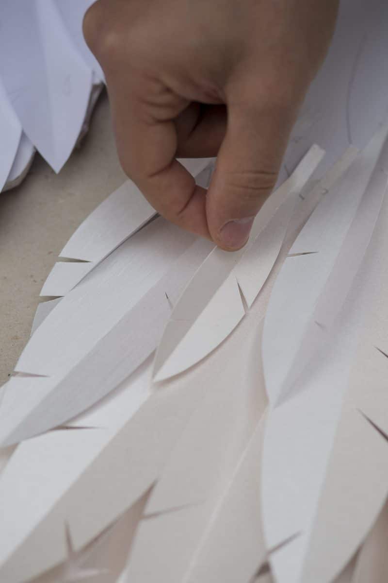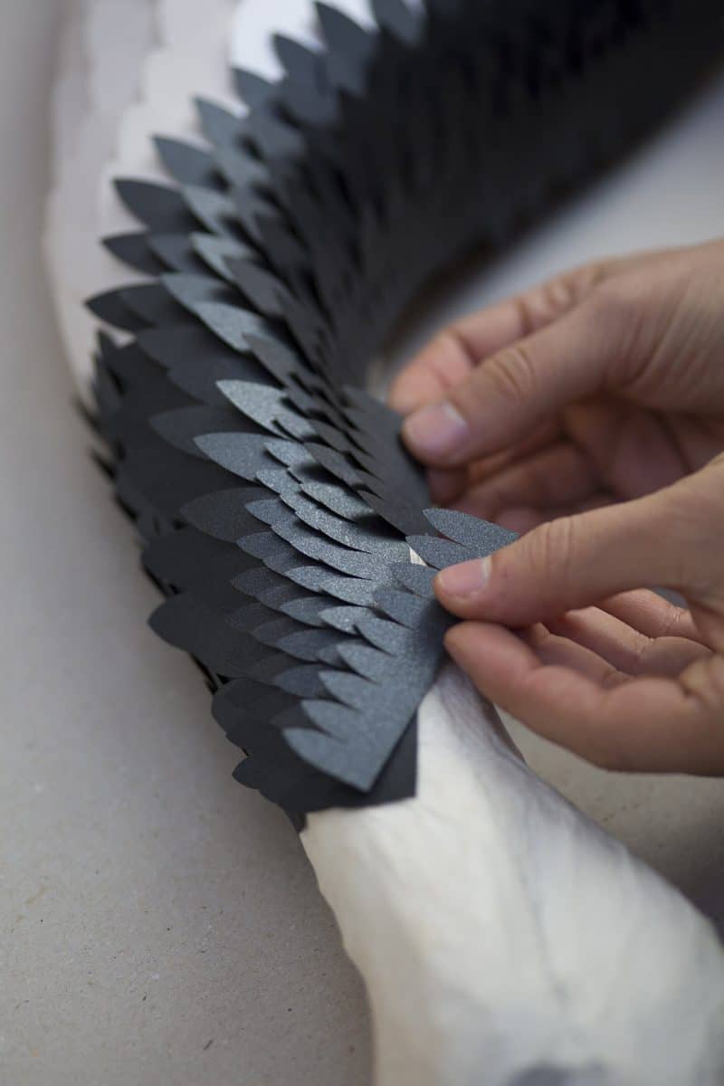 Cada uma das penas do grou “Kori” (“gelo” em japonês) foi recortada à mão em cinco tipos diferentes de papéis Fedrigoni: Constellation Jade E21 Silk 115 g, Cockcle Premium White 250 g, Sirio Pearl Ice White 300 g, Sirio Pearl Oyster Shell 125 g, Cocktail Black Russian 120 g.
