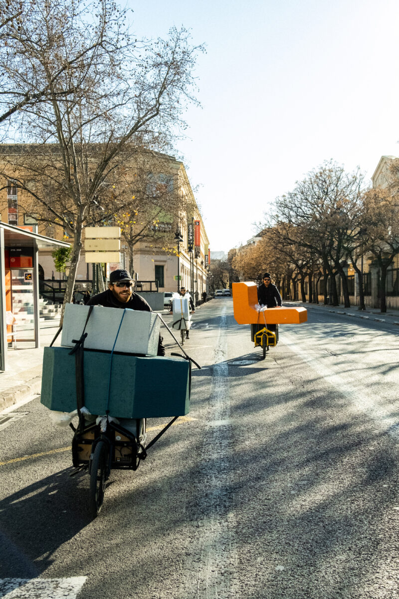 A escultura é composta por várias peças elaboradas com papel reciclado e caixas de cartão de bicicletas de carga.