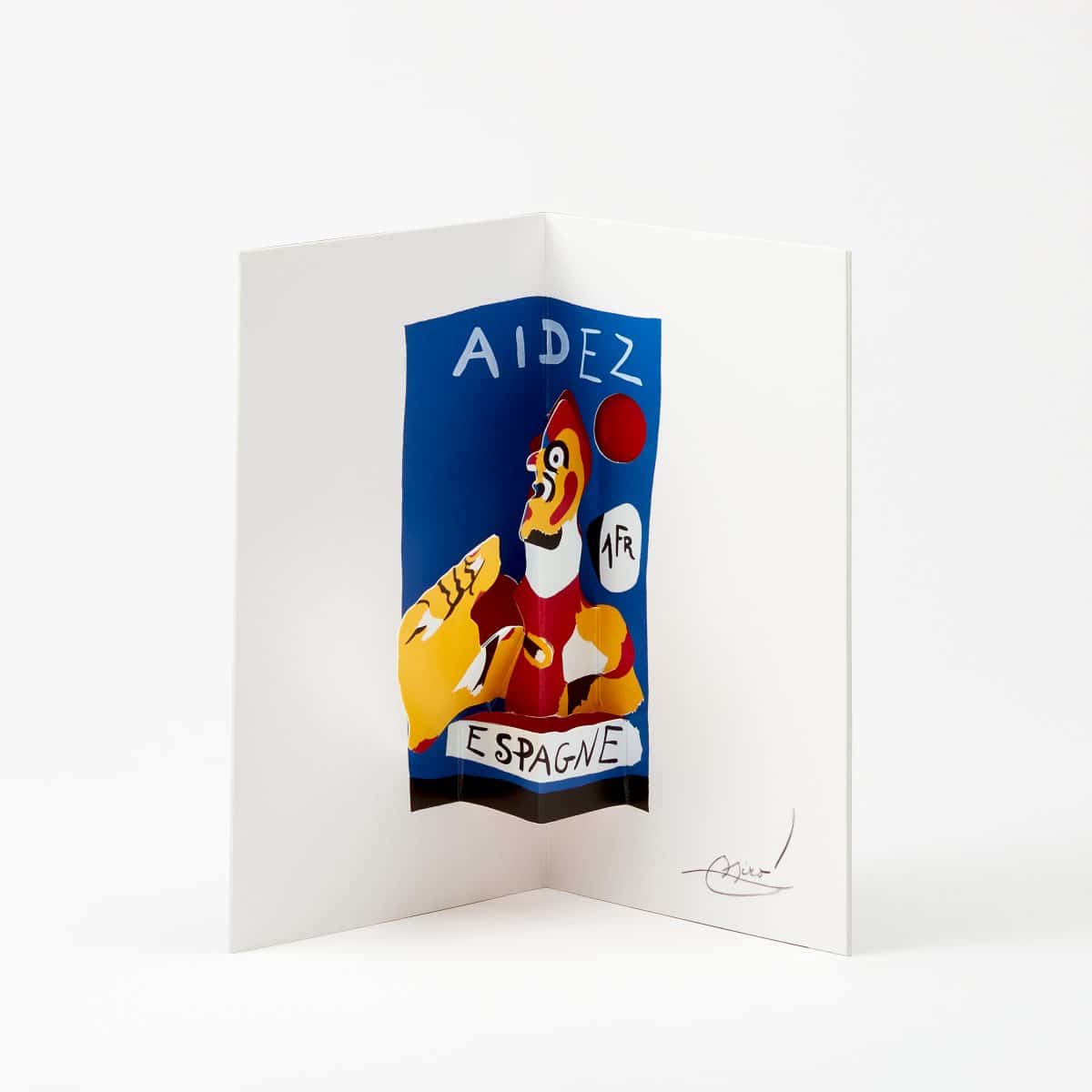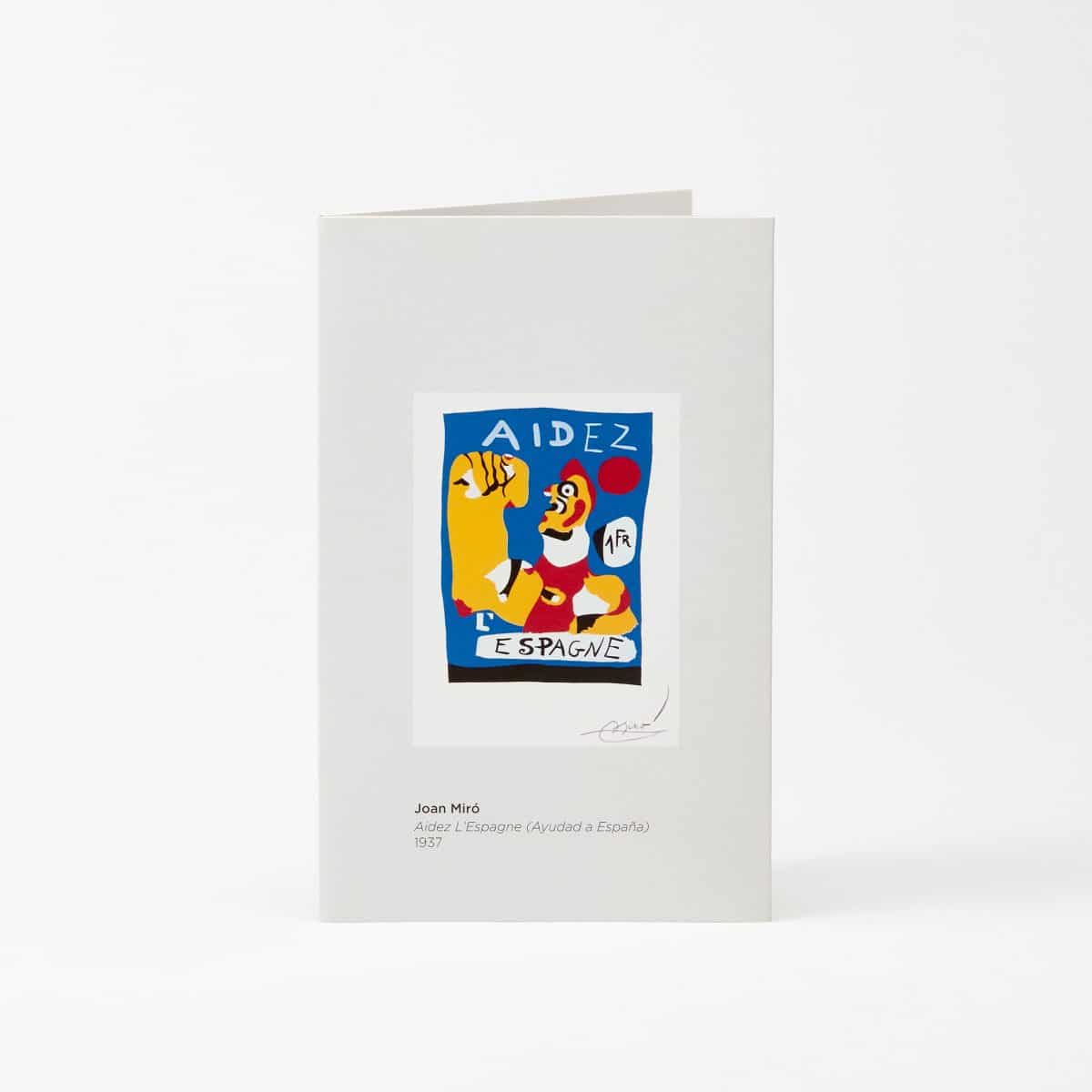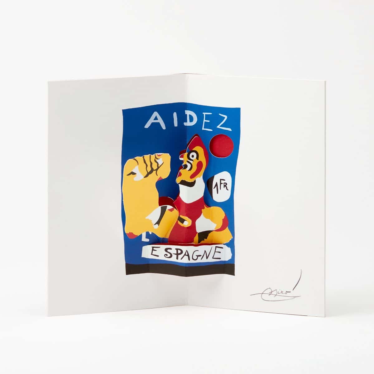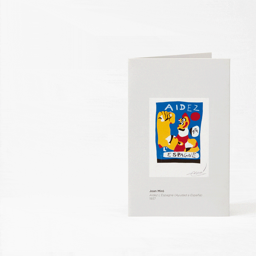 Porque, qual era a intenção de Miró com a sua obra “Aidez l”Espagne” (Ajudai Espanha), realizada para a Exposição Universal de Paris de 1937? Miró não hesitou em representar uma mensagem de motivação e compromisso republicano: “Mexam-se! Ajudem Espanha!” Uma ideia reforçada neste pop-up ao intensificar o movimento de elevação do punho à medida que se abre o postal.