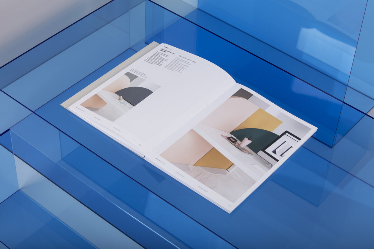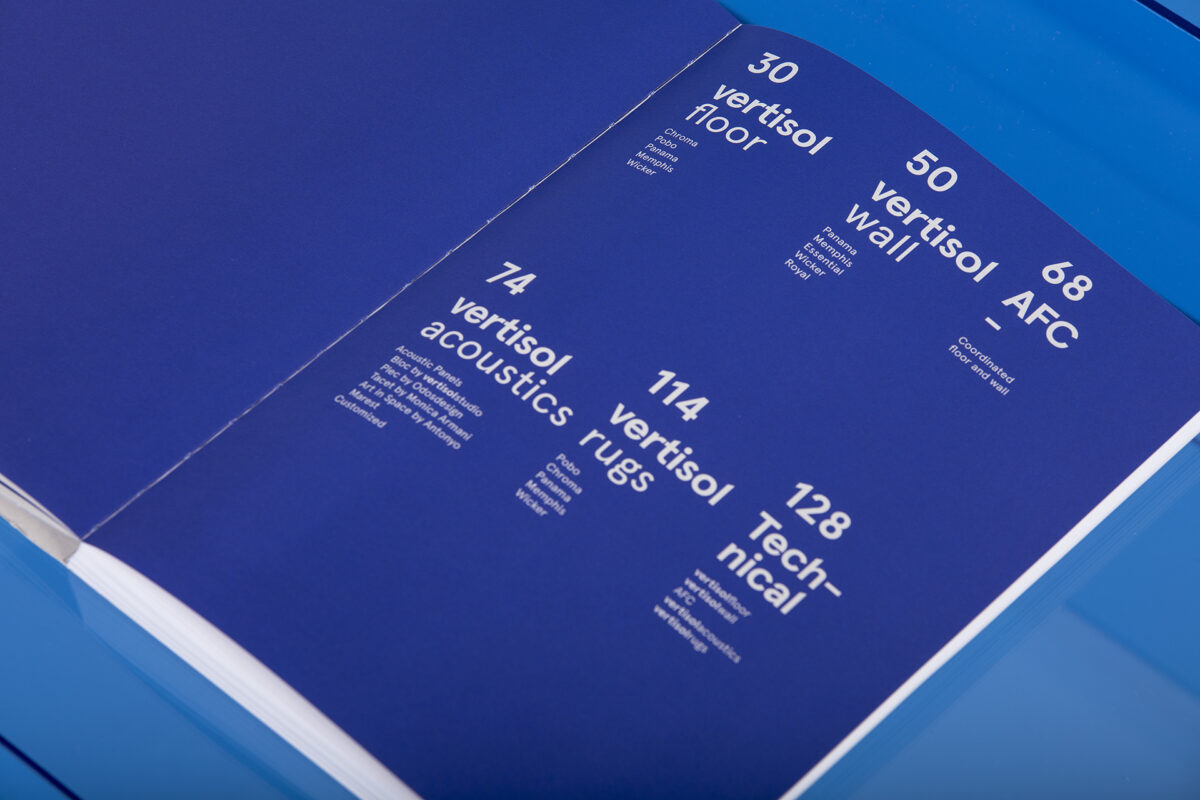 A cor utilizada no design editorial é o azul patenteado por Yves Klein, com o qual coloriram as imagens monocromáticas. Representa a união entre o céu, o mar e o horizonte, justificando assim o valor do próprio azul e a ligação que a Vertisol apresenta entre Floor, Wall, Acoustic panels e Rugs.