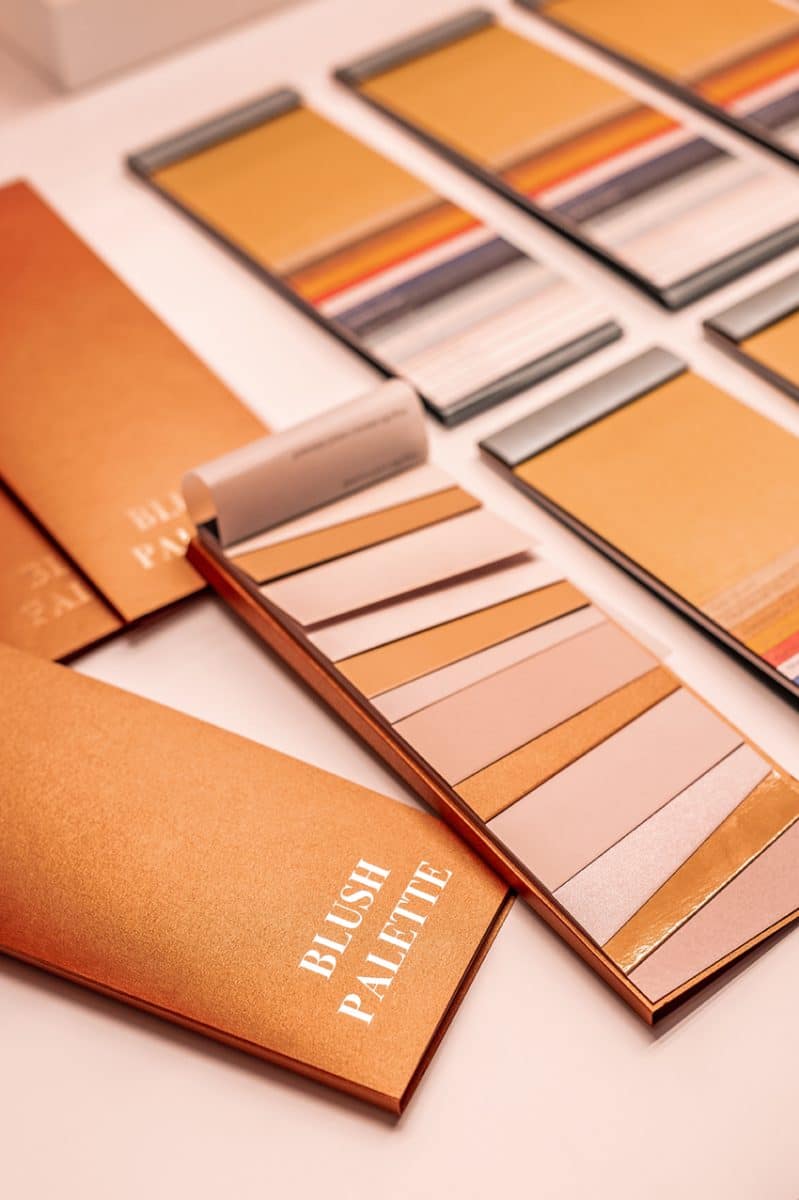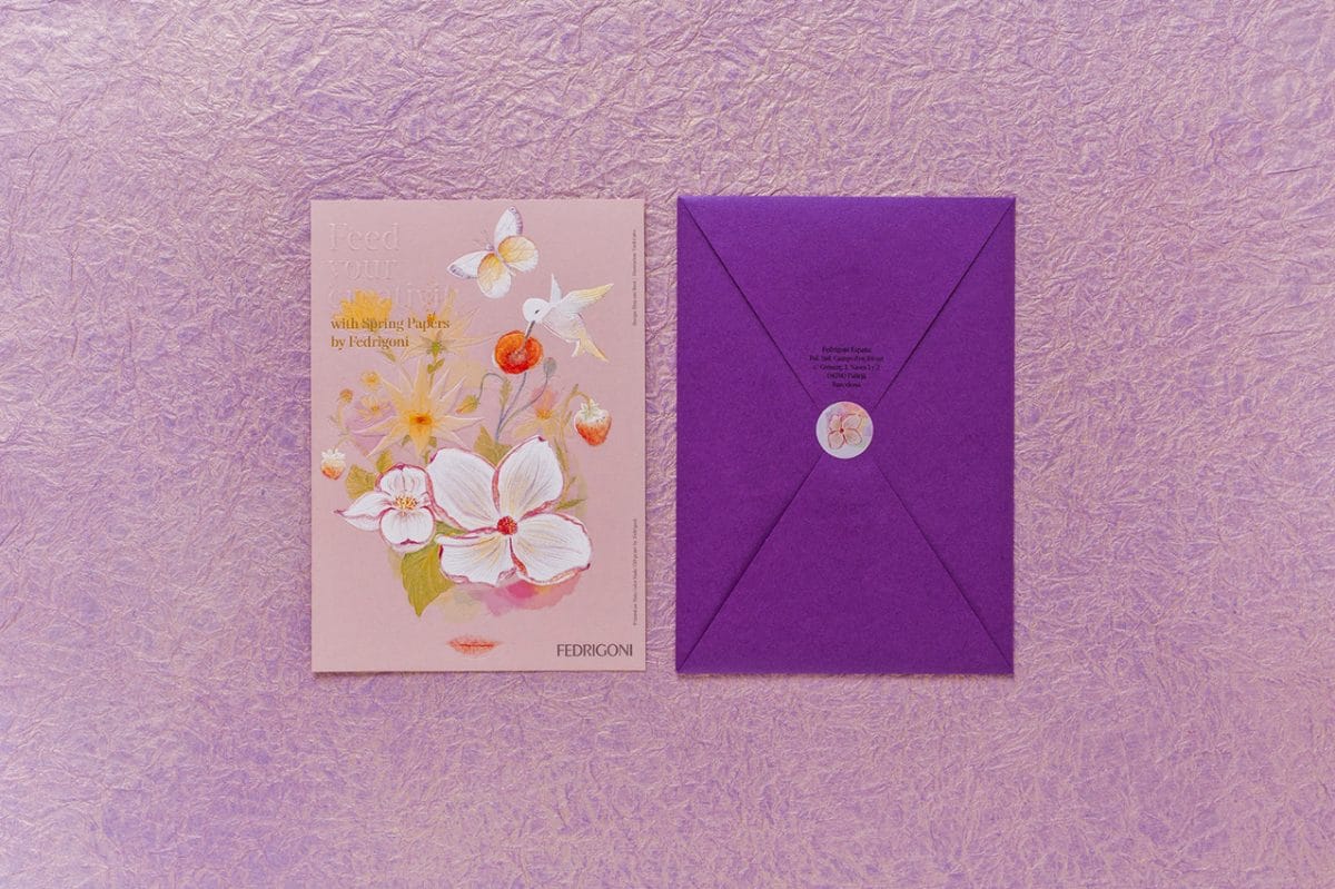 Para transmitir estas sensações foi utilizado o papel Sirio Color Nude no postal, pela sua suave superfície lisa adequada para ilustrações, e o Cocktail Purple Rain no envelope, pela sua versatilidade em quaisquer tipos de impressão e pelo seu elegante efeito perolado. As técnicas de impressão têm também um peso importante nesta criação. Graças a uma combinação de relevo a seco, estampagem, baixo-relevo e offset, associada a um toque aromatizado, esta peça transforma-se numa genuína obra de primavera.